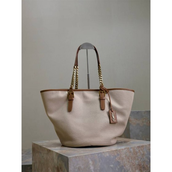 Chain splicing canvas cowhide bucket bag, simple design, large space and beauty, not afraid of collision and versatile. The bag itself is very light, with the iconic logo design tag, suitable for work or daily travel. It is the first choice for high appearance, lightweight and can hold things!