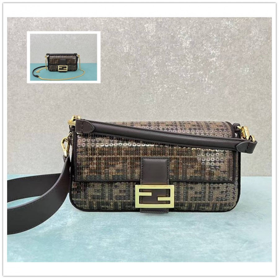 标志性迷你Baguette手袋,布料材质,全幅饰有FF图案提花刺绣,饰透明亮片。缀以FF搭扣。设有正面翻盖、磁扣、带深棕色布料衬里和一个口袋的内部隔层,复古金色金属件。手袋配有可拆卸式手柄和链式肩带,可手提、肩背或斜挎。GCK GHK