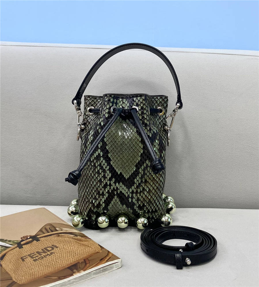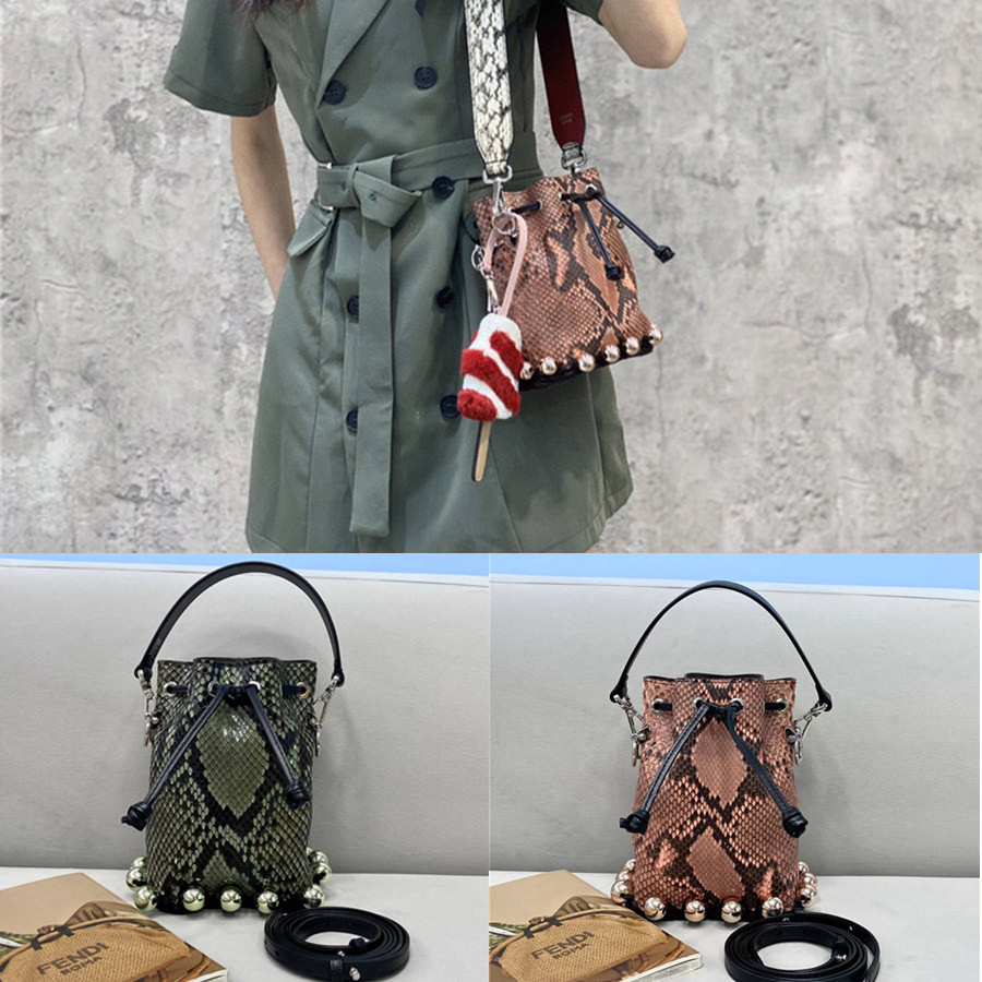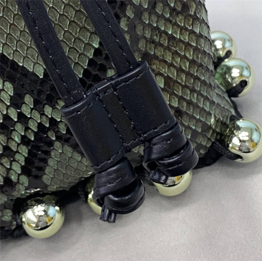 The bottom of the FENDI BKIK snakeskin mini bucket bag is made of metal pearls, with a drawstring closure and hand-stitched. Size: 12x18x10cm full package invoice, style number 638