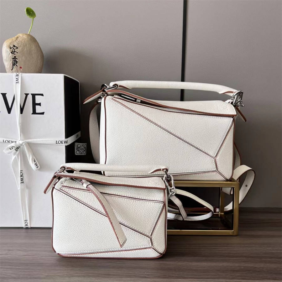 LOEWE's debut handbag * The rectangular shape and precise cutting technology create Puzzle's unique geometric lines * This mini version is made of soft grain cow leather. The mini Puzzle can accommodate, for example, a small vertical wallet, most sizes of mobile phones (up to 6.1 inches), and a sunglasses box, with adjustable shoulder or crossbody straps, Removable * One internal pocket and one external rear zipper pocket * Cowhide leather zipper head * Herringbone cotton canvas lining Anagram embossed