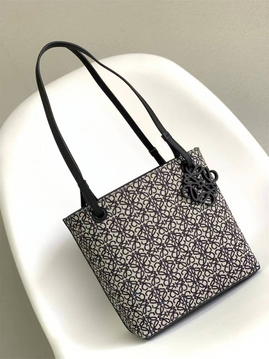 Multi purpose Square Tote handbag * paired with a longer cow leather top handle and leather Anagram pendant. This version is made of cow leather and jacquard canvas, decorated with repeated Anagram patterns* Shoulder back or top handle carrying * Cow leather strap fixation * Large internal pocket * Cow leather lining * LOEWE Made spray metal embossing.