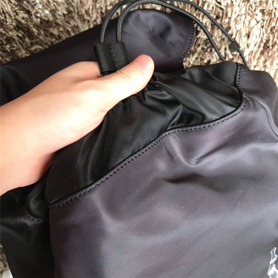 Black nylon fabric with medium mountaineering style, front flap lock with buckle and modern Bally stripe detailing. The backpack features a drawstring lock and an interior lining for ample space and side pockets. The exterior is equipped with three zip pockets: two side pockets and one front pocket. Rich structure is quite practical!