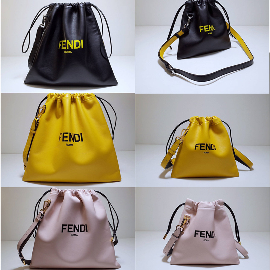 [FD Home] New product clutch with drawstring, nappa leather material, decorated with yellow "FENDI ROMA" print. The spacious, lined interior and gold metal handbags are equipped with adjustable and detachable comfortable shoulder straps that can be carried, shouldered or cross-body.
