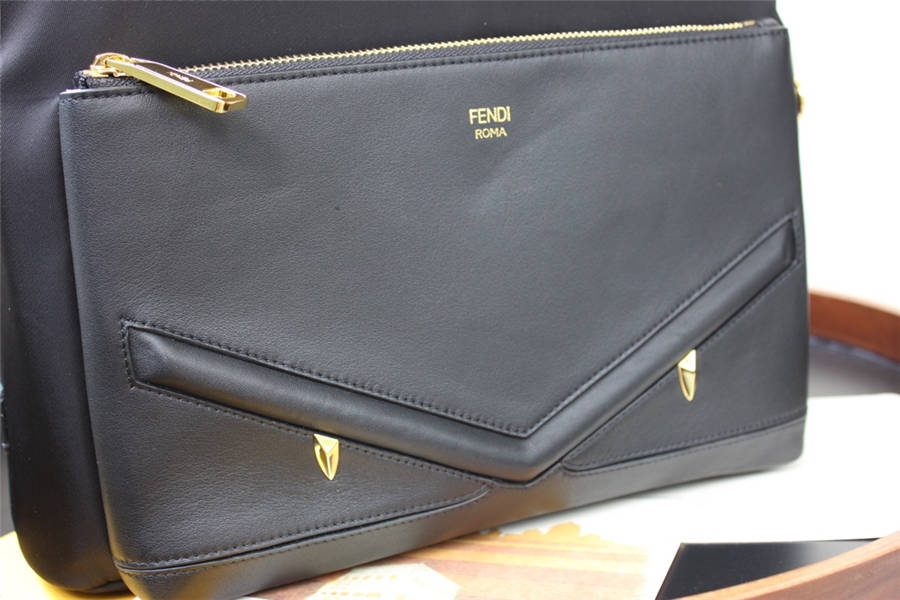 Large front pocket backpack. The back is made of breathable high-tech mesh fabric, and the shoulder straps are adjustable. Double zipper closure and internal pockets. Black nylon material. The leather pockets are decorated with embossed embossed appliqués and metal studs shaped like "Bag Bugs eyes". Golden metal finish. Size 33*14*39cm