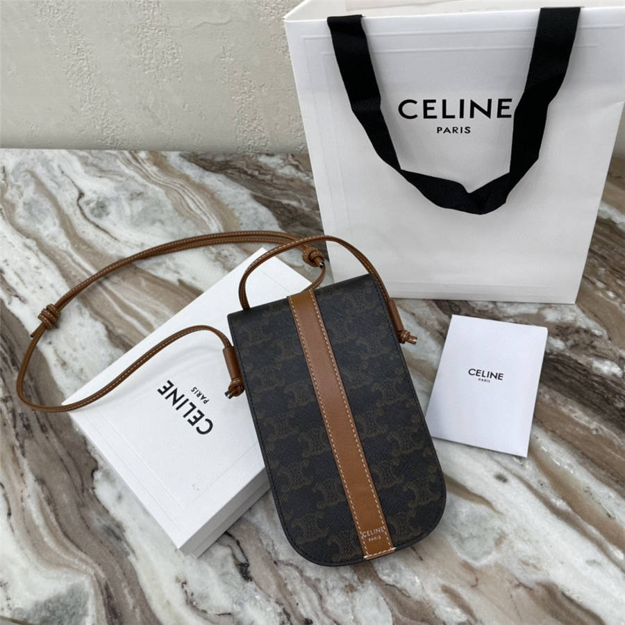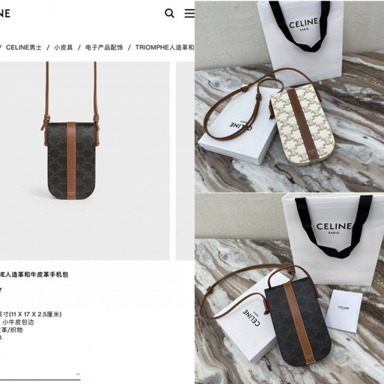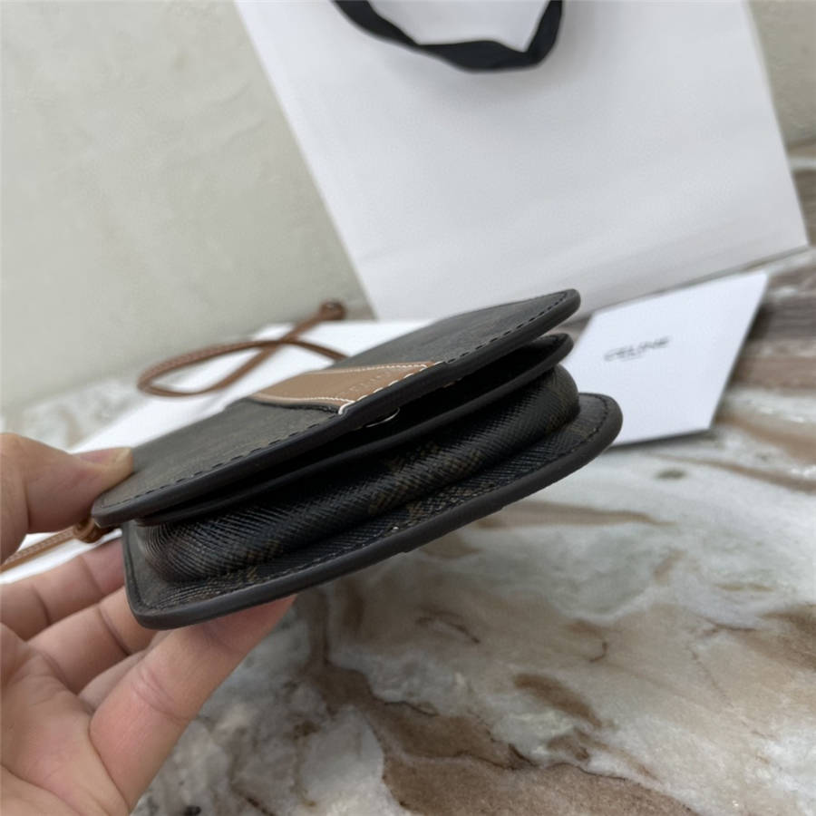 TRIOMPHE artificial leather and cow leather phone case tan 4750 CNY 4 X 7 X 1 inch (11 X 17 X 2.5 cm) coated canvas, calfskin edging lining: cow leather/fabric silver metal parts crossbody and shoulder back snap flap main Compartment 3 credit card slots and 1 external flat pocket Adjustable leather shoulder strap length 22 inches (55 cm) No.: 10H742DCH.04LU